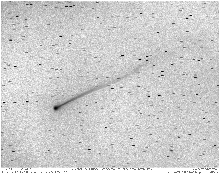From home this morning - Bellagio station Via Lattea L06 - with refractor ED80 f.5 +ccd field 2°30'X1°50' made comet C/2023 P1 (Nishimura) with very hazy sky with Moon.Demonstration of very active comet