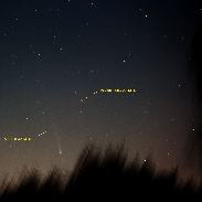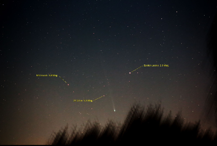 Tail was splitting two rather bright stars, 3.8 MU Leonis and 2.9 Epsilon Leonis. 22 G Leo at 5.3 was nearby. This image: 20x16 seconds, Canon DSLR, 125mm.