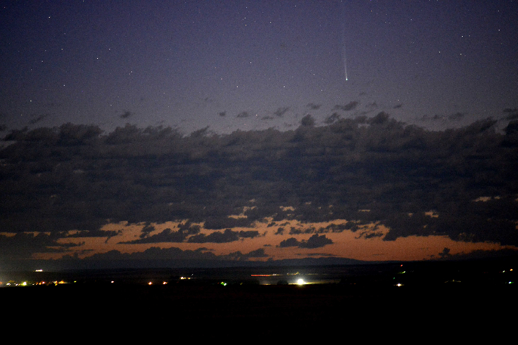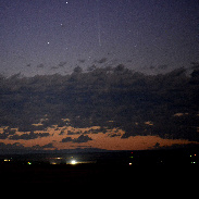 The comet was hiding behind some clouds in the direction of Yellowstone National Park. As it started to get light the comet came out from behind the clouds. Exposure 8 seconds at f2.8 and ISO 1600. Taken at 5:31 a.m.MDT with a 180mm Nikkor lens using a Byers Camtrak.