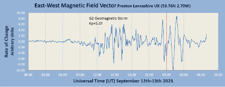 Here's the geomagnetic response recorded on my homebrew magnetometer in the UK to the surprise G2 geomagnetic storm, which was sparked by the arrival of a CME yesterday.