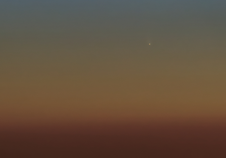 Comet Nishimura is approaching perihelion and can be spotted with some effort on very clear skies shortly after sunset. Nikon Z7II + Sigma 100-400 @300mm, 23x3sec exposures @ ISO 200. Comet only 4° above horizon. Cropped image.