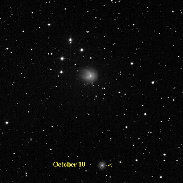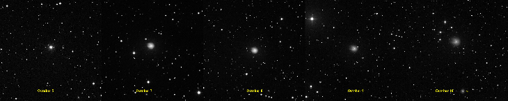 There appears to be an initial eruptive jet (horizontal tail in image) with the outburst seen on October 5, 2023 much like the eruptive jets observed by probes such as Rosetta in high-detail. By October 7 the jet is absent, but the coma once again as in July appears to be developing the "Pac-Man" or Horseshoe morphology. By October 9th the coma appears more transparent with central body's glow much more apparent. The coma is still enlarging on Oct. 10 while becoming more diffuse and transparent with central body more prominent. On October 10th galaxy UGC10845 was in close conjunction (shown arrowhead) it is mag 14.3 quite close to the reports for 12P. It too is a diffuse object with a central core- its core appears quite similar in brightness but the diffuse light from the spiral arms is much smaller and difficult to compare.
