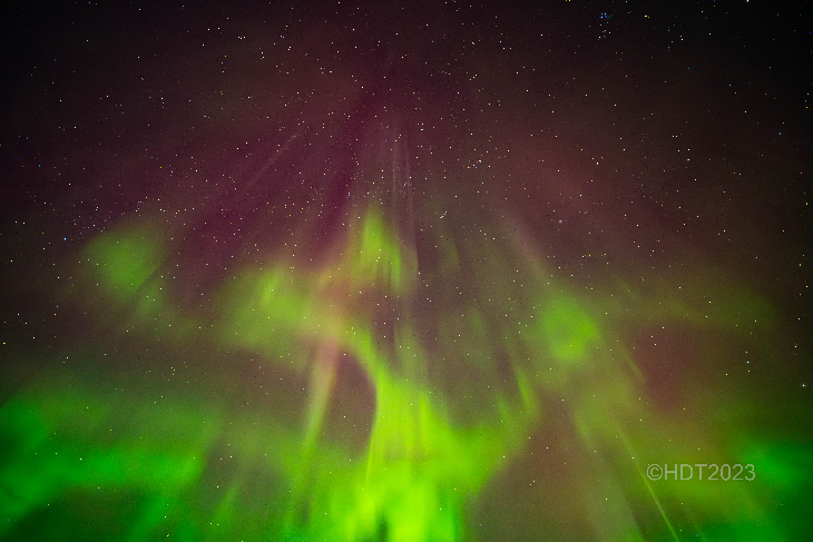 Due to the fog in the area I had to find a high point above the valley floor. The sky literally exploded with an intense aurora at around 0715 UTC. The movement was incredible fast and I had to reduce the shutter speed to 3 sec du to the intensity of the aurora. This was a very unique aurora due to the solar wind speed of 330 km/s, one would hardly expect the aurora to go coronal but it did. There were several out burst of auroral beads, which I have never seen before, and lastly the shapes in the aurora were quite odd.