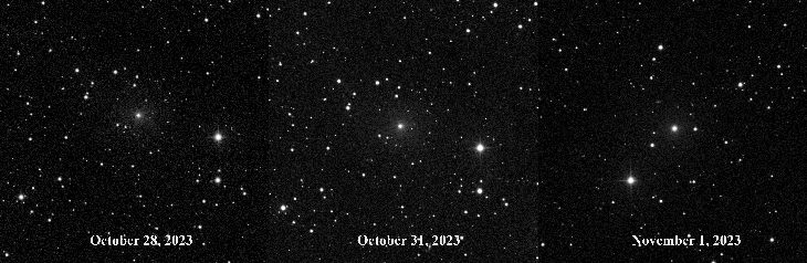 All images were captured with iTelescope T11 9 x 60 sec. processed separately and assembled into this montage. The outburst occurred now that there is a Moonless window as the new coma develops that will make for great imaging sessions in the days ahead.