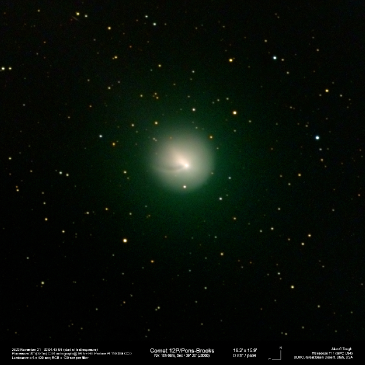 Comet 12P/Pons-Brooks imaged using a 20" CDK (iTelescope T11) at the Utah Desert Remote Observatory. Note the faint green outer coma.