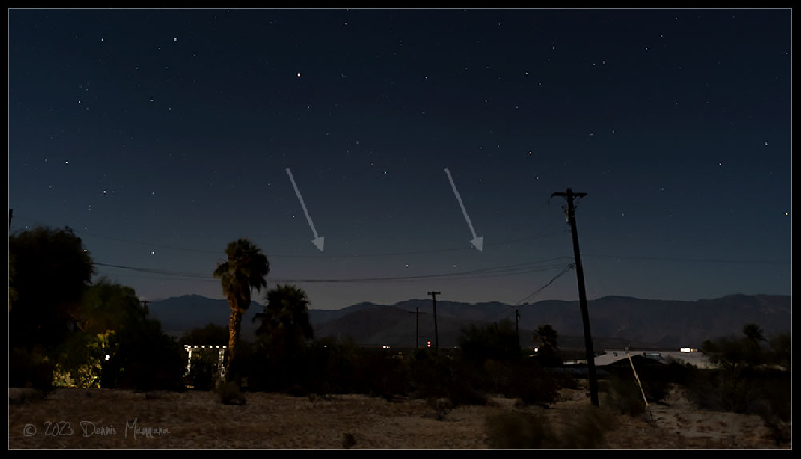 With the Kp index forecast to reach 7 this morning, I suspected we might get a little red auroral glow low in the north, even though I knew it would be overwhelmed by the light of the 82%-illuminated moon. Nevertheless, I stumbled out to the backyard at 4:30 a.m. to try a shot or two. I was right on both counts. The glow showed up on the photos, but the moonlight made it impossible to see with the eye. I've added arrows to show where the auroral glow is (in case you’re wondering why we have arrows among the stars and you don't!) 😜 For us to actually see the aurora from the U.S. Southwestern deserts happens on rare occasions--and only if moonlight (or light pollution) doesn't interfere. In the Arctic or Subarctic, however, the aurora can seen even under the light of a full moon or city! Details: Nikon D750, ISO200, f/2.8, 13s exposure at 4:59 a.m. PST.