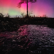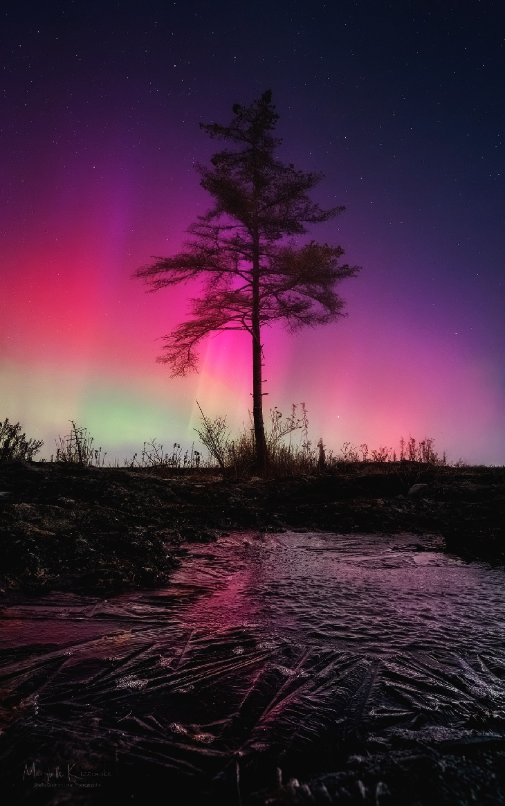 Aurora at this location, it finally came together! This is my favorite tree in Wisconsin, and it requires a decent geomagnetic storm to make this work. I found a little patch of ice with neat textures to make the composition. Therefore, this is a focus stacked image.
