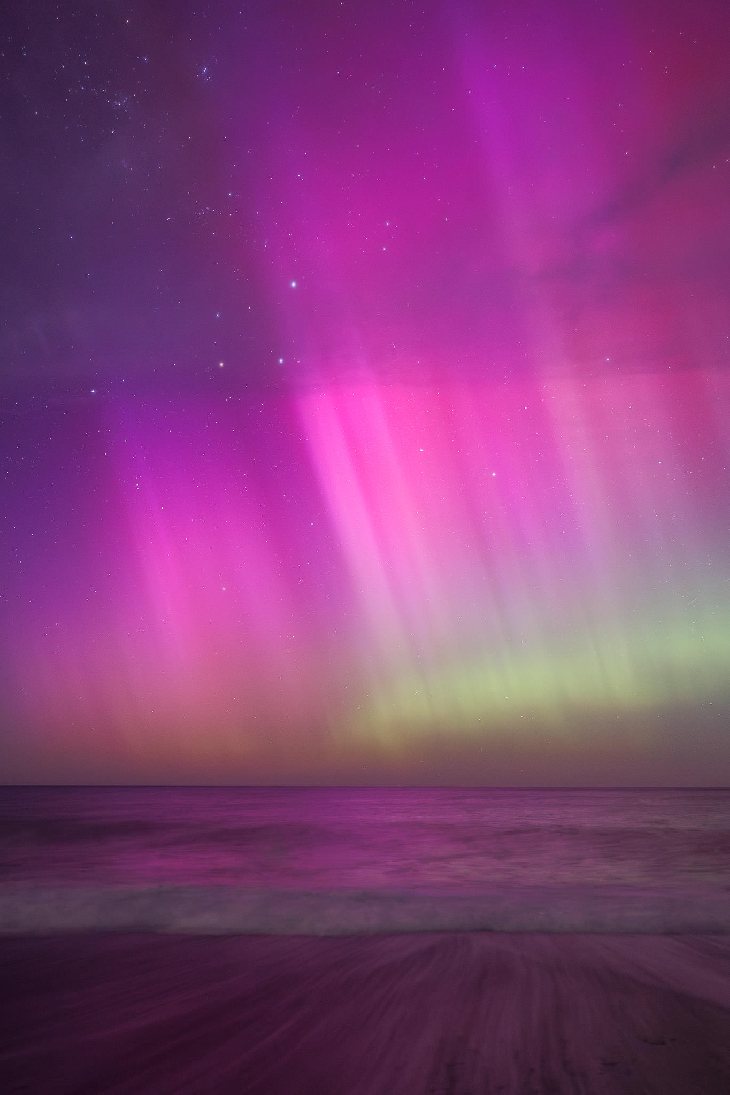 An incredible show last night on the Canterbury coastline overlooking the Pacific Ocean. Given most forecasts predicted cloudy skies for Canterbury, we got lucky with just a thin veil of high cloud (producing a stunning sunset) and generally clear southern skies. As NZ skies darkened at nightfall, a cannibal CME arrived (a fast moving storm cloud overtook some slower, weaker plasma material) delivering a cloud of charged particles ready to rain down Earth's magnetic field lines. The resulting interaction delivered a light show that lasted for hours and that was easily visible to the naked eye (as usual the naked eye view was rather monochromatic and a little fuzzier than what the camera sees.) Nonetheless, it was a stunning night on the beach with faint aurora to be seen during twilight, some beautiful rays and a very prominent arc around midnight followed by an incredible display of rays in the early hours of the morning. The sound of waves crashing onto the beach and washing across the stony pebbles created the perfect soundtrack for the Southern Lights.