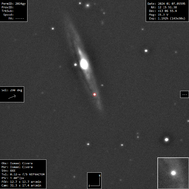 Image of extragalactic supernovae sn2024gy in galaxy NGC4216 taken with achromat refractor of 120 mm F5 and ASI 290 MC camera. 143 x 30 sg esposures.