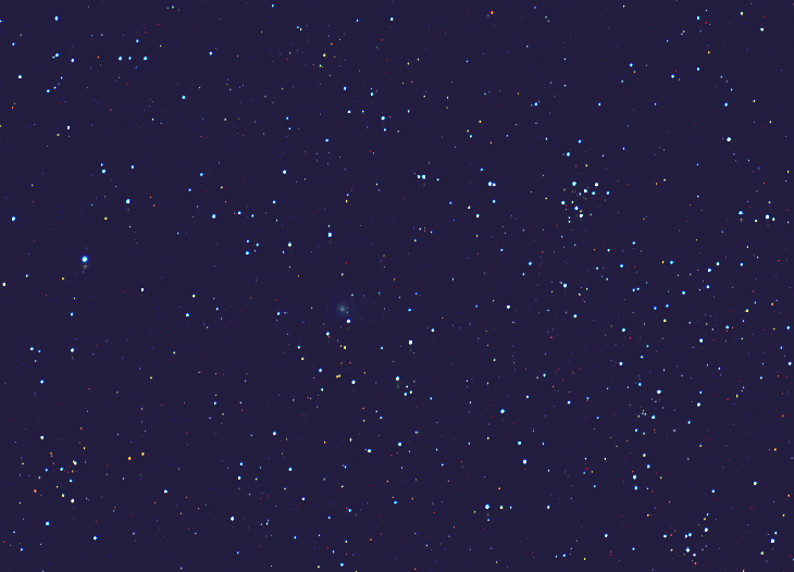 On the evening of Jan 15th Comet Pons-Brooks passed 1/2° S of the sparse but distinctive open cluster M29 headed E. Its brightness was listed at mag 9.3. The blue sky is due to an almost 1Q Moon.