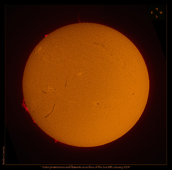 After so much stormy weather this was the first clear morning since the New Year began to observe and take some images of the Sun….As you can see from the picture there was an active Hedgerow prominence on the eastern limb and to the north an interesting surge/spray prominence that was shooting out into space ☺ ☺ ☺