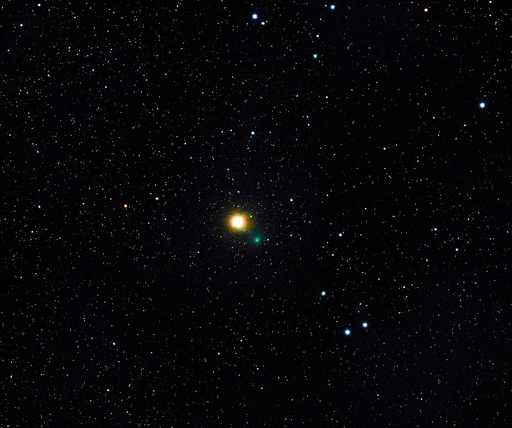 On February 10, 2024 Comet 144P/Kushida had a close conjunction with Aldebaran. This image is 10 min of 15 sec subs captured with a Vixen VSD astrograph and a Nikon Z7II camera. The comet is just bright enough to be a striking contrast to the star.