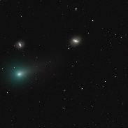 Comet 62P/Tsuchinshan with lovely barred spiral galaxies NGC4608 and NGC4608 in the Virgo Cluster. 50 x 60-second exposures with a 17.5" f/2.6 reflector. The comet is almost at a standstill right now as it is about to start moving retrograde in the sky, so that makes processing the images easy!