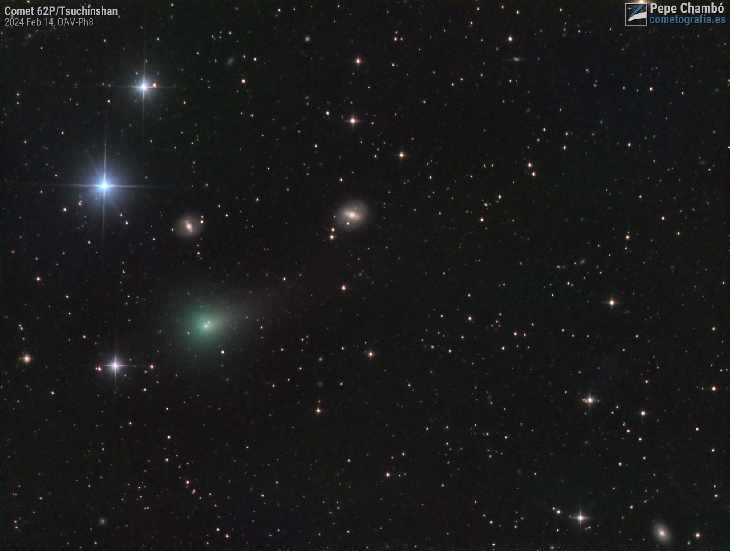 Comet 62P/Tsuchinshan on February 14, 2024, while it was located over the Virgo Cluster, a collection of over a thousand galaxies spanning about 8 degrees in the constellation Virgo. In the image field numerous galaxies can be seen, highlighting NGC 4608 just above the comet and NGC 4596 in the direction of its tail; both are lenticular galaxies with a well-defined central bar and are located at a distance of 55 million light-years. The bright blue star is Rho Virginis with a magnitude of 5, while the comet shines at magnitude 9.5 with a green gaseous coma and a tail extending half a degree in length.