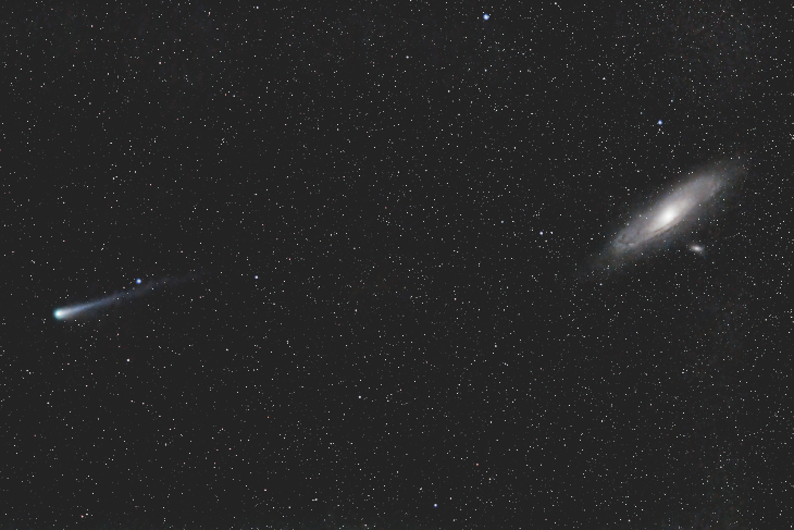 Although the comet is only 250 million kilometers from earth, with Andromeda 23 trillion kilometers distant, they are now sharing the same part of the sky.