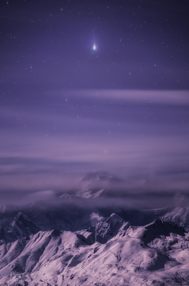 The other night, aurora active was low, so I switched gears and concentrated on the comet. Saw that it lined up pretty nice with Mt. Denali in Alaska, so defined to give that a try. What a wonderful sight to behold! This is a 200mm frame. So you see the top of Denali with a thin layer of clouds. This created such a dreamy atmosphere, I couldn't have asked for anything better! Also, this was done with a nearly 40% moon - so while the comet details are muted a bit, the light on the clouds and mountains just made my night!