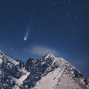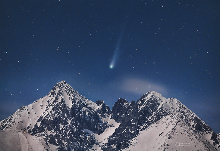 This image I planned very long, but despite precise planning, thousands of kilometers of driving, and good equipment I always failed due to bad weather. But on 19 March 2024, I finally succeeded. So what is so special in this view? Obviously, the celestial visitor, comet 12P/Pons-Brooks with its beautiful tail, appears over mountains, illuminated by gentle moonlight. While on the right, Kežmarský štít (alt. 2 558 m) can be seen, on the left it is accompanied by higher Lomnický štít (alt. 2 634 m). If you take a closer look, on the summit of Lomnický štít is a building. In fact, it is one of the highest-located astronomical observatories in central Europe. Between 1946 and 1959, just in the period when comet Pons-Brooks visited our Solar System last time, several other comets were discovered in this magical mountainous place. The image was taken from Veľká Lomnica, about 11 km away from the summit.