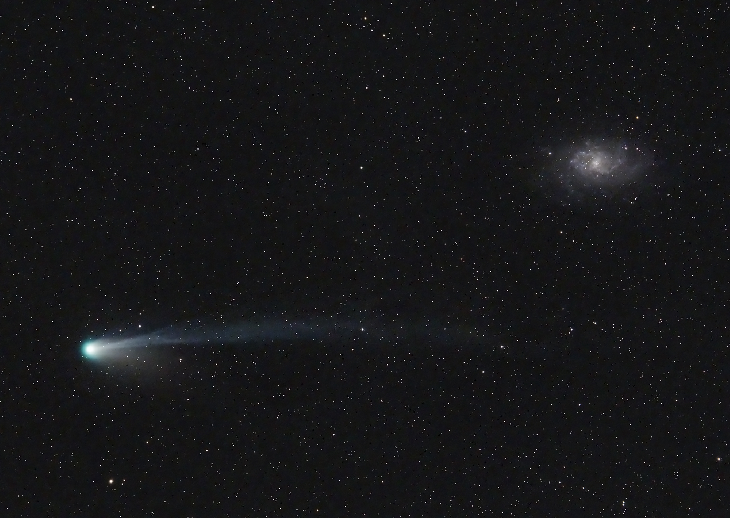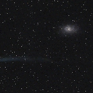 The weather is about to get cloudy so I got in a shot of Comet 12P passing near M33 in Triangulum. Is it so low in the sky this far south it is tricky, had to fight a lot of sky gradient. This is 37 x 30s with a Canon 200mm f/2L lens and ZWO ASI2600MC camera.