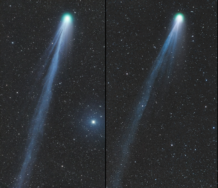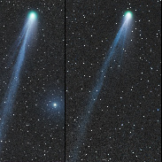 Despite unfavourable weather (both at my place and at the remote observatory) I managed to take some images of comet 12P with its beautiful ever-changing ion tail before moonlight got too strong. The left image shows the comet on the evening of 03/12 passing by the bright (4.28 mag.) blue star Pi Andromedae, while the one on the right was taken on 03/15, with a 35% thick crescent Moon illuminating the sky.