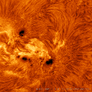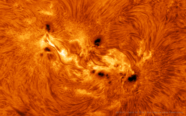 Solar active region AR3615 is a fine example for the sun's active state. Very magnetically complex the area contains multiple sunspots, filaments and plagues. Details: Askar 185Apo, Daystar Quark Chromosphere + Lunt40, erf, ZWO ASI174MM