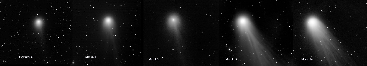 During March 2024 the former "devil comet" has rapidly brightened to a nice binocular object.With a telescope it is now amazing with multiple jets of gas streaming from the nucleus. This montage shows the evolving 12P Pons Brooks over the prior month.