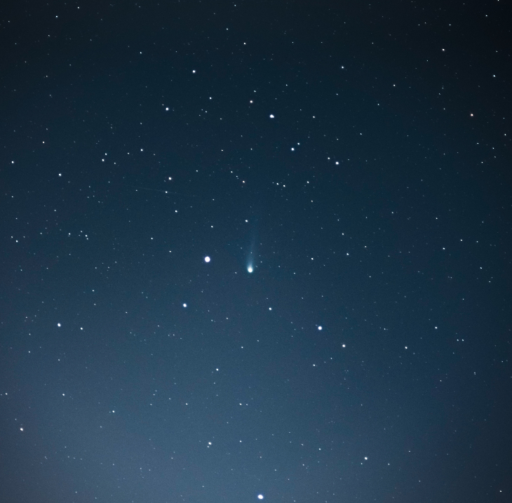Comet Pons-Brooks from Groomsport. Much clearer skies tonight, this is a crop of a stack of 30 images using a 135mm lens. With the naked eye, it just looks like a faint but slightly fuzzy star next to the star called Hamal in Aries. Canon EOS R with Optolong L-Pro and a vintage 135mm f2.8 Rikenon XR lens