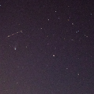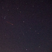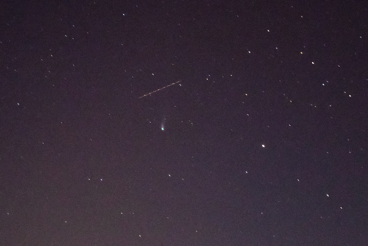 Comet 12P Pons-Brooks with aircraft, satellite and more. Not visible with with binoculars or naked eye. Picture made with Canon 80D and Sigma 18-250 mm on tripod. Time 21.07 on 02.04.2024 from our balkony, ISO 3200, F 5.6, 106 mm, 7.8 Sek.