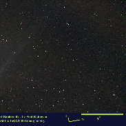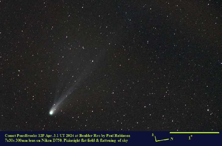 In 25x100 binoculars, the outer coma and tail seemed rather faint, but the center was stunningly bright and star-like (DC9). Seems to be flaring for sure. Apr 3.1 UT 2024. Camera info in pictures.