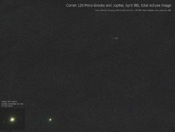We have nice clear weather in northern Arkansas, so I tried to catch a comet near Jupiter. And I was successful! There it is. During the day, around 1:56 PM. Used my Canon 6Dmod camera and Samyang A35 mm lens at F2. Combine of 14 images 2,5 seconds each at ISO 800. Hard to process, but a bit of the tail clearly visible. Also there is Jupiter and moons.
