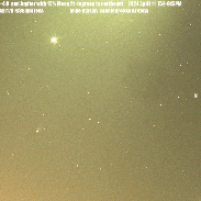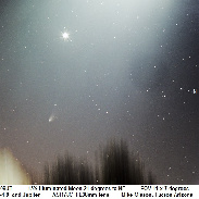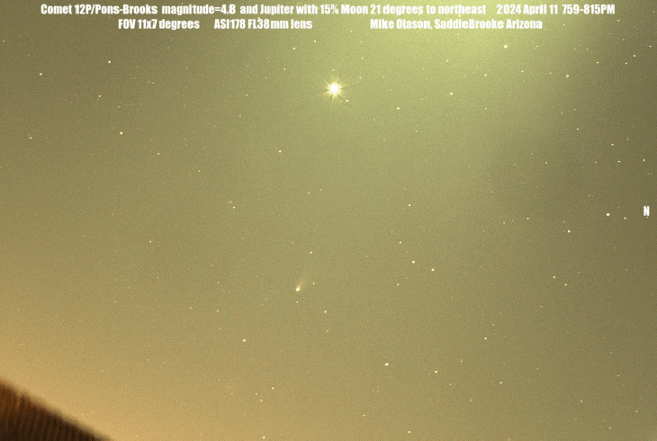 Comet 12P/Pons-Brooks with Jupiter and the 15% illuminated Moon 21 degrees to the northeast of the comet casting a greenish white hue on the animation as twilight skies turned dark on the evening of 2024 April 11. As one can see even a Moon that is only 15% illuminated and only 21 degrees from the comet cast a greenish white hue on the comet that dims the comets coma and tail in pictures and binoculars. To make things worse the comet dimmed from magnitude 4.4 from the previous evening to magnitude 4.8 this evening as calculated from software that is not affected by the Moonshine. As the Moon moves farther away from the comet over the next week the view thru binoculars should become much better. The comet will be about 3 degrees below Jupiter for the next several evenings and then 4 degrees to the lower left of Jupiter for the next week.