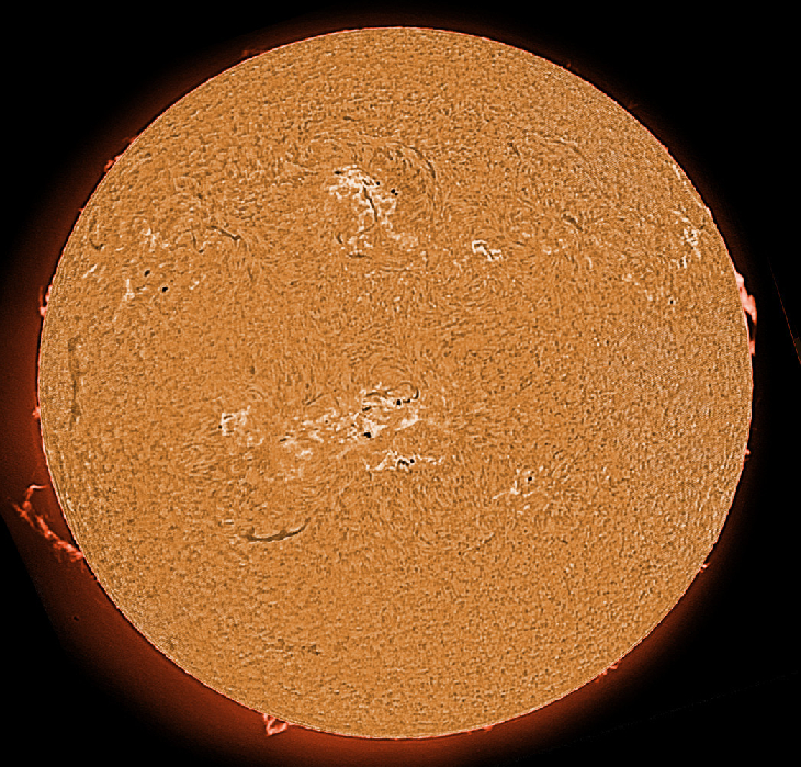 Interesting prominence in SE. Complex spot systems.