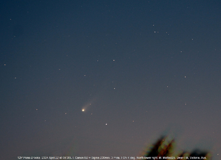 12P Pons-Brooks on 2024 April 22 at 09:00UT using a Canon 6D + Sigma 200mm. 4 mins. FOV 4 deg. North lower right. from Swan Hill, Victoria, Aus.