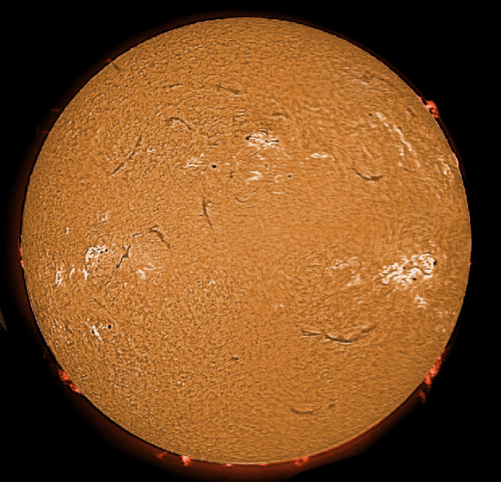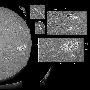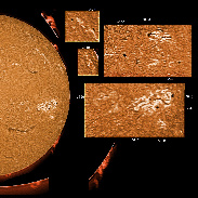 Observing conditions poor today with much cloud dodging necessary, but many spots and small prominences.