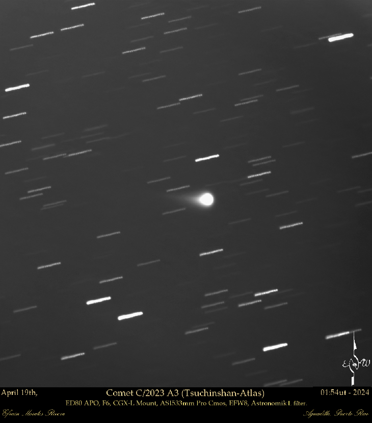 Comet C/2023 A3 (Tsuchinshan-ATLAS) on April 19th, Comet C/2023 A3 (Tsuchinshan-ATLAS) is currently in the constellation of Virgo, at a distance of 287,886,146 kilometers from Earth reaching its peak in September/October 2024.