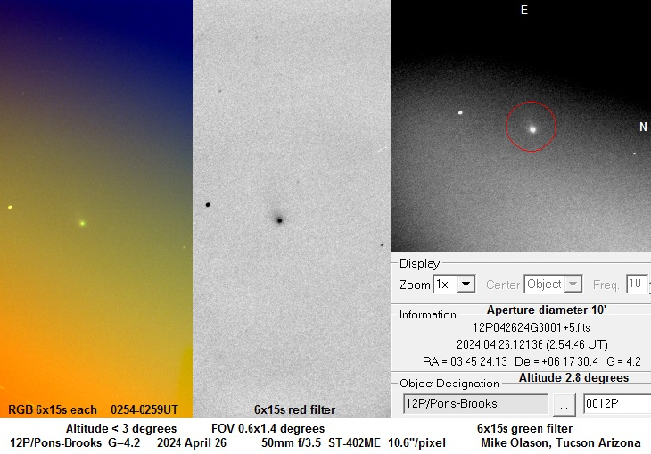 Comet 12P/Pons-Brooks on the evening of 2024 April 26 UT was magnitude G=4.2 as calculated from 6x15s images taken thru a green filter in an aperture diameter of 10'. A very windy day left one to assume that with all the dust in the air that the images would not be very good at such a low altitude, but the images were colorful and data was good, all things considered. Dust storm predicted for tomorrow and some clouds, not sure if images will be possible 2 evenings from now from Tucson as the comet gets ever lower, but as someone kinda said, no one ever takes images of comets sitting on the couch so we shall try. Click on the large image to get the full resolution image.
