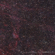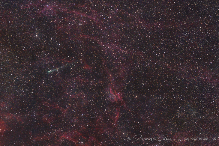After shooting galaxies last week, I tempted the clouds and went after another comet that's been on my list, C/2021 S3 (PANSTARRS). It's drifting through the Cygnus Milky Way right now on its way out. The whole area is webbed with red emission nebulae, whipping up some great combos. The brighter knot below center is the Propeller Nebula LBN 278. And open cluster NGC 6866 sits toward upper right. The comet's tail is showing about a degree long, so still pretty fun photographically. UTC 4 May 2024 0903–1102 || Canon EOS R5 || ZenithStar 61 II APO + Flat 61A || iOptron SkyGuider Pro || 48 x 121 sec., ISO 800 || PixInsight, Photoshop, Lightroom