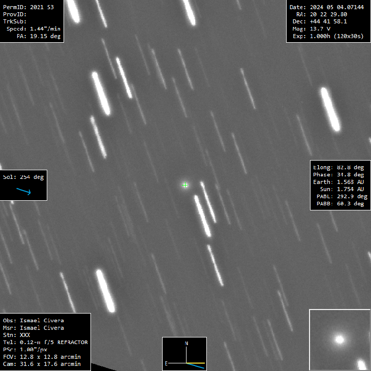 Comet 2021 S3. Image taken with refractor 120 mm F5 and camera ASI 290 MC. 120 frames of 30 seconds each. Filter UV/IR SVBONY.