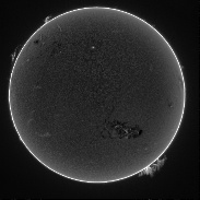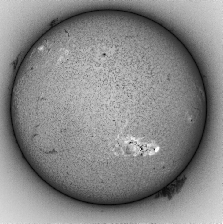 Sudden brightening of large sunspot at 1154 GMT saturated the pixels, Coronado PST, ZWO 678MC, 500 x 1.2ms frames, best 50% autokkert4!, Lucy Richardson deconv in imppg and curve adjust, photoshop for dehazing and curve adjustment.