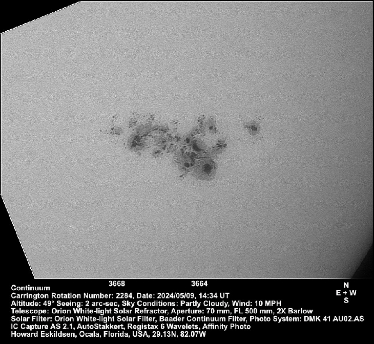 Today's close up solar images of AR 3664 in continuum, Ca-K, and H-alpha. AR 3664 was visible through eclipse glasses once again today.