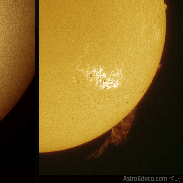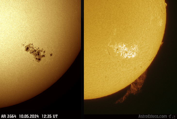 Spectacular Group AR 3664 on friday 10.05.2024 from Cabreja Mountain Amateur Observatory MPC J45 with two filters. Solar Continuum (left) and H Alpha (Right). Taken a few hours before to the great night of auroras.