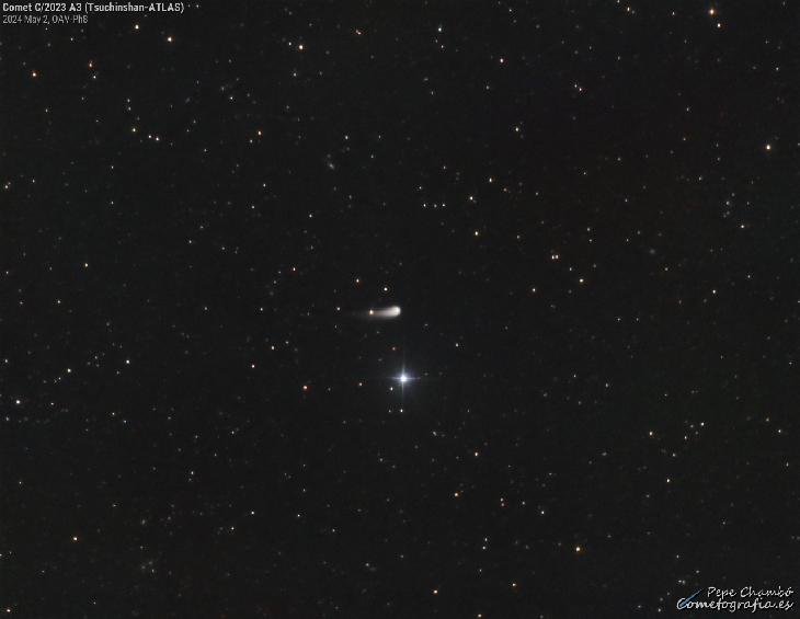 C/2023 A3 (Tsuchinshan-ATLAS) @ 2024 May 2, 21:46 UT Comet C/2023 A3 (Tsuchinshan-ATLAS) observed on May 2, 2024, shows a brightness that has remained at magnitude 10.5, the same as I recorded three weeks ago. However, the angular length of its tail has doubled, from 2.5' to 5', probably due to the increase in the phase angle, which implies that we now observe it more from the side. In the image, the comet's tail can be clearly seen extending to the left, with a bright and well-defined coma. This pause in the increase of brightness is common in comets visiting the inner Solar System for the first time. Hopefully, it will soon resume its brightening trend. Telescope TS-Photon 8" N f/3.6 Mount SkyWatcher EQ6R-Pro Camera Atik 383L+ Exposure 47 min. (L=44x60 bin1 + RGB=1x60 bin2) From Vallés, Valencia (Spain)