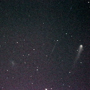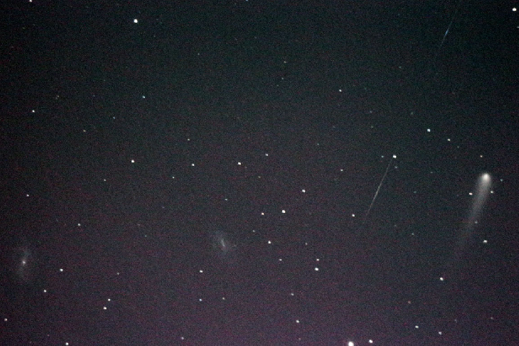 Comet A3 Tsuchinshan-ATLAS passed by two faint galaxies. NGC 4116, 12.4 mag. nearest to the comet, and NGC 4123 at 13.1 mag. to the far left. Also, I had a slow moving, rotating satellite that appeared on two frames. Canon T4i, Homemade 12.5" Newt., 5 images, total of 235 seconds at 6400 iso, between 03:30-03:37 UT 5-30-24