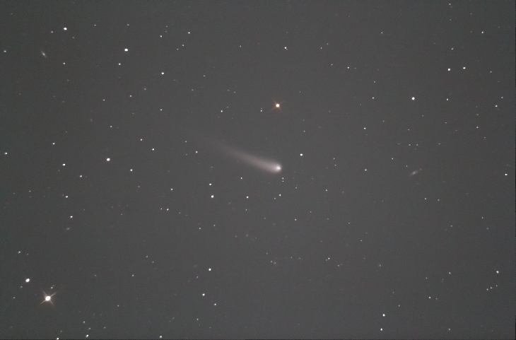 I don't know why they have the magnitude 11.2. I could see the tail very easily. To me it seemed 9 magnitude. Modified canon T2i. 4 - 1 minute exposures at ISO 3200. It was getting low in the sky. Background is peppered with small galaxies. 12.5 "inch F/5 Newtonian scope.
