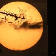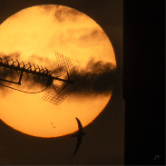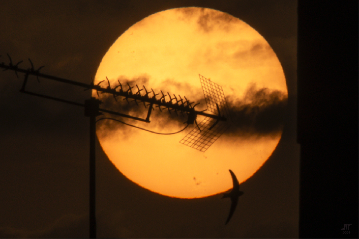 sol, vencejos, nubes, antena de televisión y edificio que se podían ver sin filtros de densidad neutra con el sol relativamente alto (4º) gracias a algo de calima, 21:21 y 21:22 / dslr, 400 mm, recortes