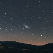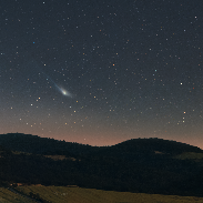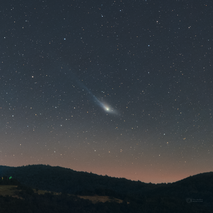 These days we can enjoy another comet just with a small telescope in our hand. Its name is 13P/Olbers, discovered by famous astronomer Heinrich Wilhelm Olbers (1758-1840) on March 1815. Comet's orbital period is now around 70 years which makes it visible for most of us only once in our lives. Coincidentally, with another brighter comet of this year--12P/Pons-Brooks, both will appear on our sky again in 2094. If you don't want to miss it and you are located in the Northern Hemisphere, try your luck upcoming weeks low over north-west horizon under the Ursa Major constellation. The same I did yesterday from Záhradné, Slovakia, and I made it happen to capture it just over the local rolling landscape illuminated by the rising summer Moon from behind. Captured on 24 June 2024, around 22 UT; Canon Ra, Tamron 70-200mm (200mm), f2.8, ISO 1600, 68x20s (registered on comet first, separately on the foreground, comet tracked on Vixen Polarie U).
