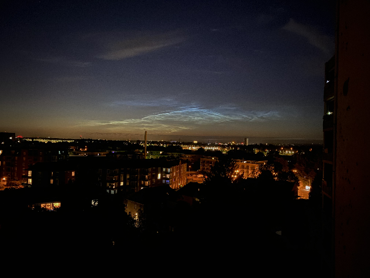 When I went out at 11:30 p.m. (CEST: Central European Summer Time (UTC+2) on my balcony on the 8th floor, I discovered in the north-northwest night sky this NLC. It was visible for about 15 minutes. Taken by iPhone 11 Pro Max, App ProCamera LowLight+.
