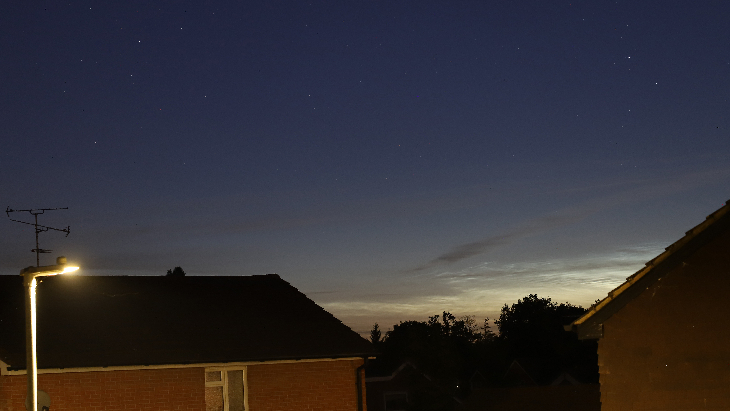 Following a bright and complex evening display on the 28th, the NLC re-appeared again in the early morning of 29 June around 1.30 am. This photo was taken at 0227 BST (0127 UT) around 10 minutes or so before it faded into brightening twilight in the south of England at 51.42 degrees N.