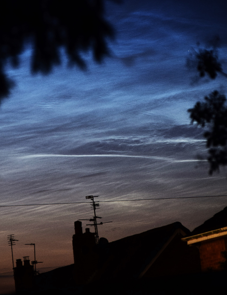 Second night of visible Noctilucent clouds here in Hale village near Liverpool UK, seen late evening on the 30th June & early morning 1st July, viewing conditions not the best tonight due to street light pollution etc