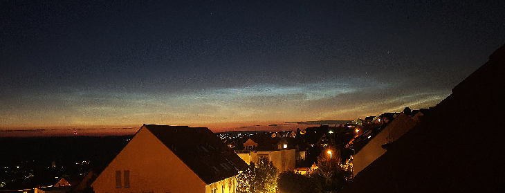 Nice display of NLCs along the northern horizon around 22h UT, similar in strength to NLC displays in solar minimum years. Rather subdued blue colours but pronounced wave patterns. Lasted for about 45 min.