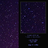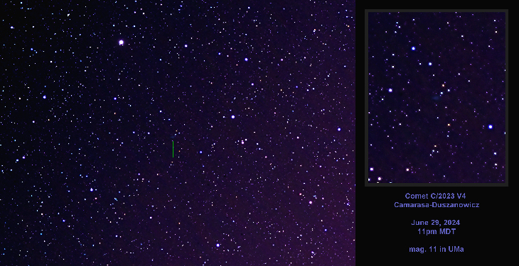 A small tailless comet moving east at ~3 arcmins/hour (or ~1°/day) near omicron UMa, the bright star at upper left. The comet is listed at mag 11, but I couldn't spot it in 15x50IS binoculars in a dark sky.
